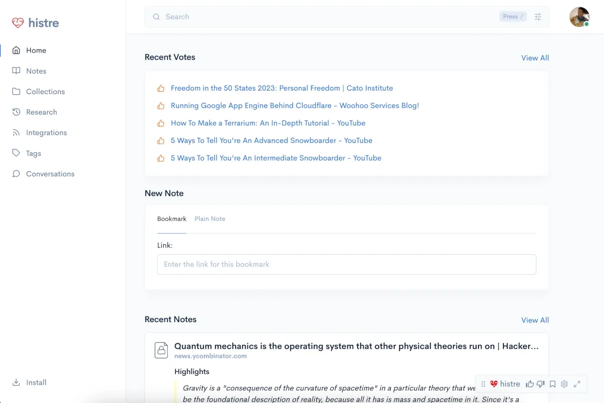 histre automatically organizes your knowledge, and gives you tools to annotate, highlight, collect, summarize, search, and share easily.
